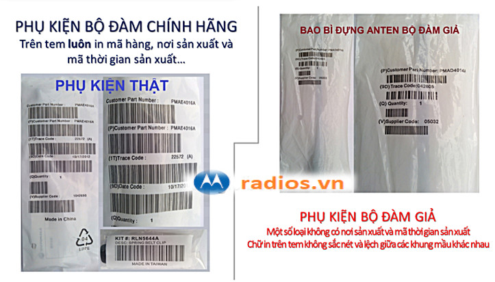 2. Phân biệt bộ đàm Motorola Thật/ Giả dựa trên tem nhãn mác dán trên phụ kiện