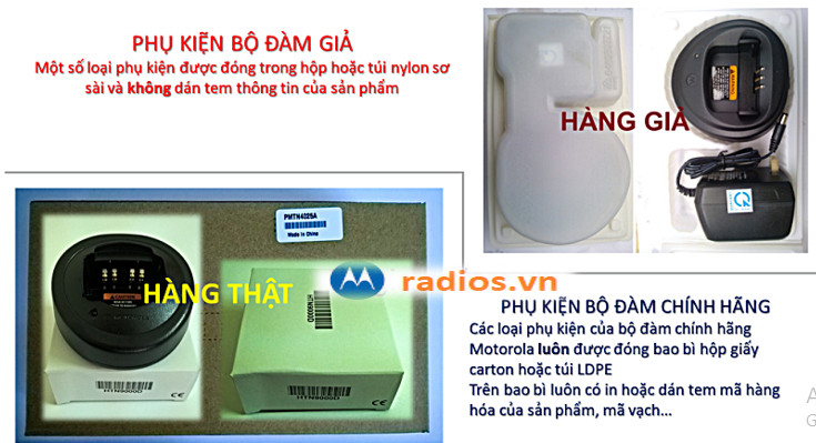Trên thị trường các model máy bộ đàm Motorola Solutions bị làm nhái nhiều nhất, mức độ hàng Giả/ Nhái ngày càng tinh vi khiến người dùng khó khăn trong việc muốn mua bộ đàm chính hãng. Để giúp khách hàng mua đúng máy bộ đàm Motorola chính hãng 100% Century Telecom - Nhà Phân Phối Trung Tâm Bảo Hành Motorola tại Việt Nam xin công bố một số hình ảnh cách phân biệt bộ đàm Motorola chính hãng với máy bộ đàm không chính hãng (Thật/Giả) trên tem thân máy, tem nhãn mác phụ kiện đi kèm của máy bộ đàm Motorola, vỏ hộp đựng và bao bì đóng gói sản phẩm như sau: